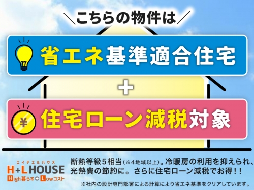 断熱等級5相当。冷暖房の利用を抑えられ、光熱費の節約に!さらに住宅ローン控除対象でさらにお得です。 ※社内の設計専門部署による計算により、省エネ基準をクリアしています。