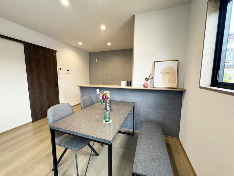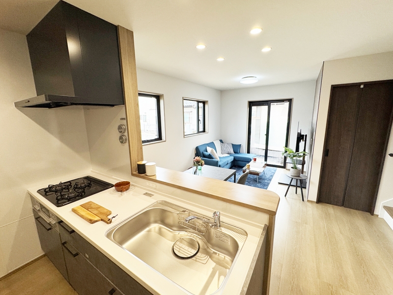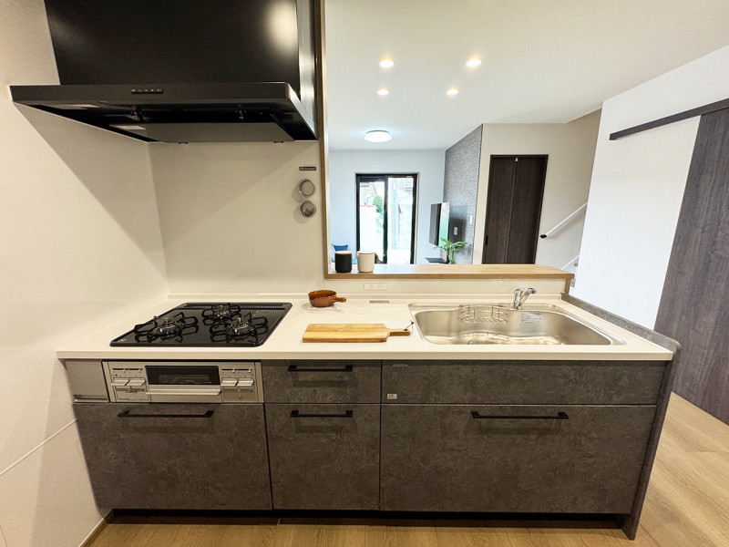 家事導線・生活の導線に優れた対面式キッチンを採用しています。空間の邪魔をしないLDKに溶け込んだデザインが魅力的で、毎日の生活を華やかに彩ります。 ※ 食器洗浄乾燥機は、付いていませんが、施工開始前に限りオプションで追加可能です。