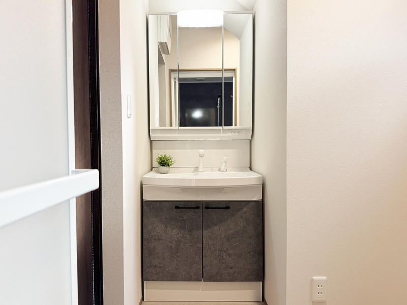 衝撃に強いホーローボウル、シャンプードレッサー付きエコ水栓を採用し、収納たっぷりの三面鏡仕様の洗面化粧台です。