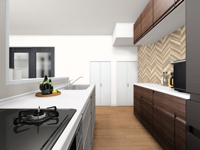 家事導線・生活の導線に優れた対面式キッチンを採用しています。空間の邪魔をしないLDKに溶け込んだデザインが魅力的で、毎日の生活を華やかに彩ります。 ※ 食器洗浄乾燥機は、付いていませんが、施工開始前に限りオプションで追加可能です。
