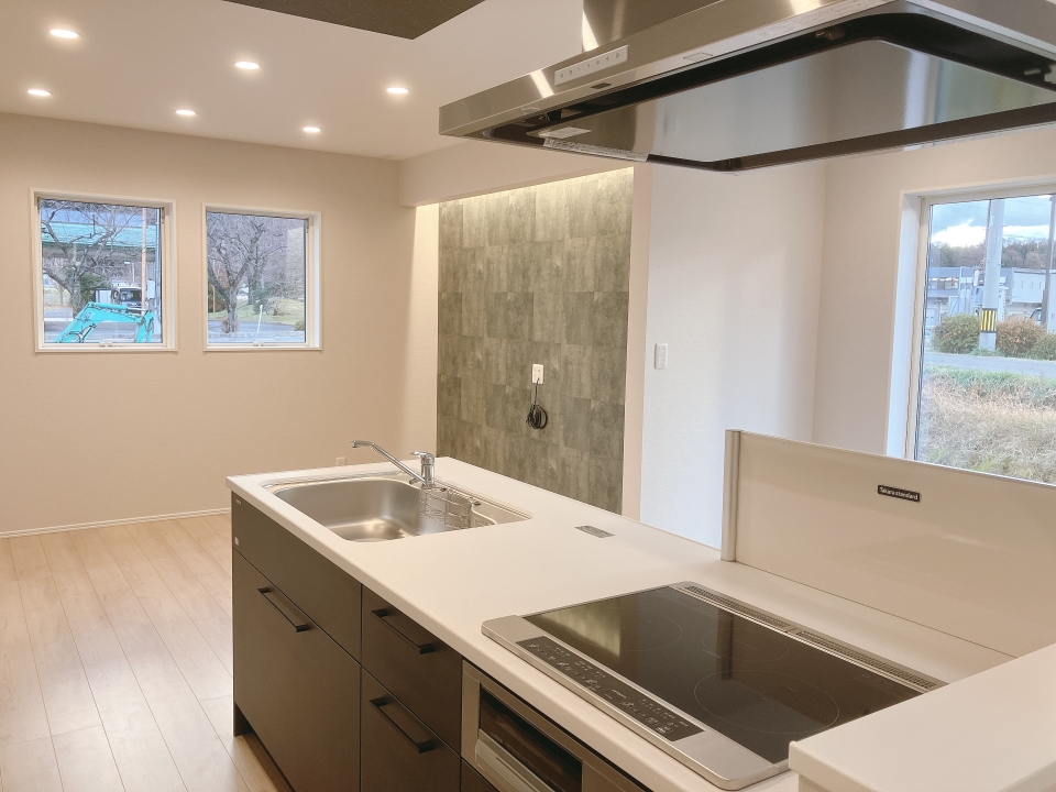キッチンスペースには嬉しいパントリー付き。普段は使わないけど集めたくなるかわいい食器や家族の誕生日には欠かせないケーキづくりのセット、さらに食品や食料のストック品を保管できます。さらに、扉を開けたらびっくり!壁の一面にアクセントを施しました。ごちゃごちゃしがちなキッチン周りがすっきり清潔!毎日整理整頓したくなりますね。