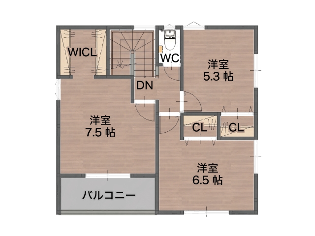 2F: 洋室 7.5帖、6.5帖、5.3帖、ウォークインクローゼット、トイレ
